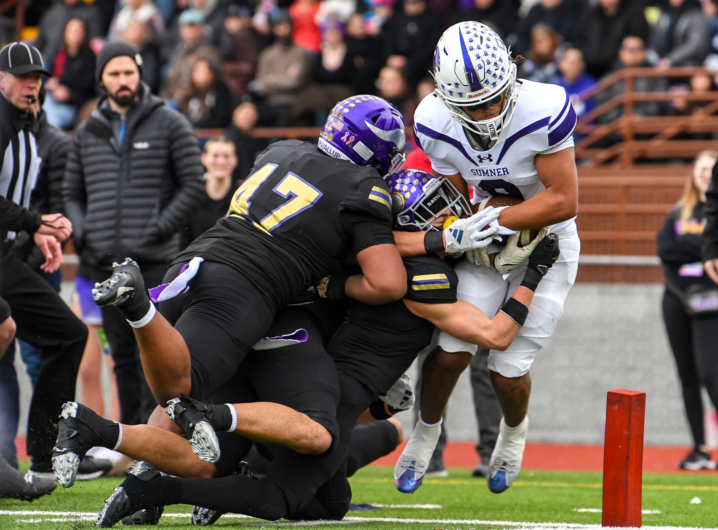 Puyallup defense shoves Lance McGee out of bounds short of the goal marker.