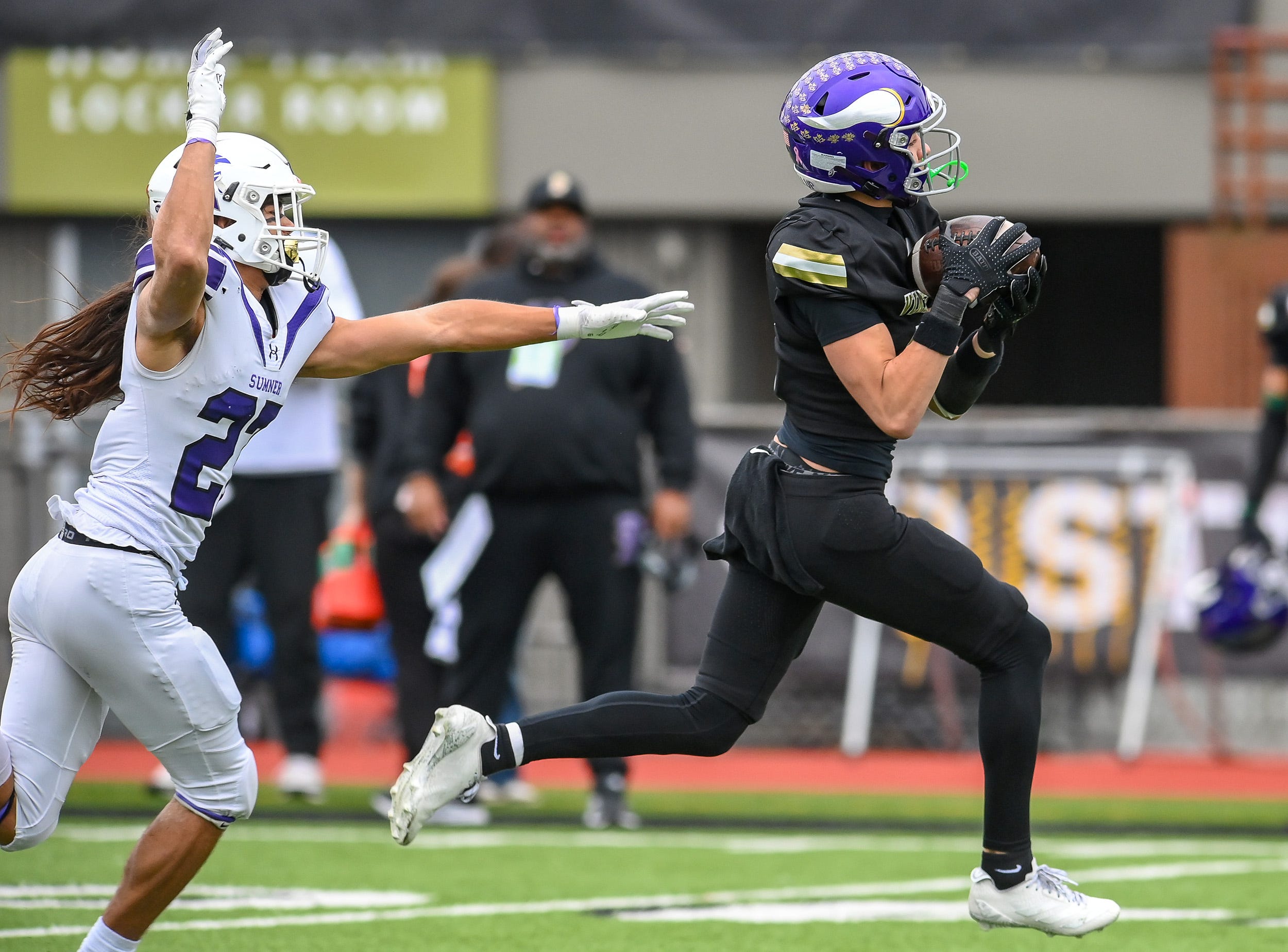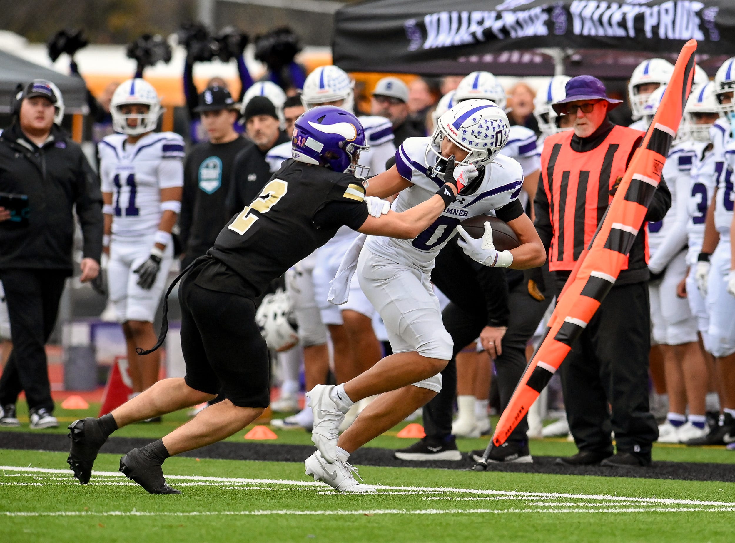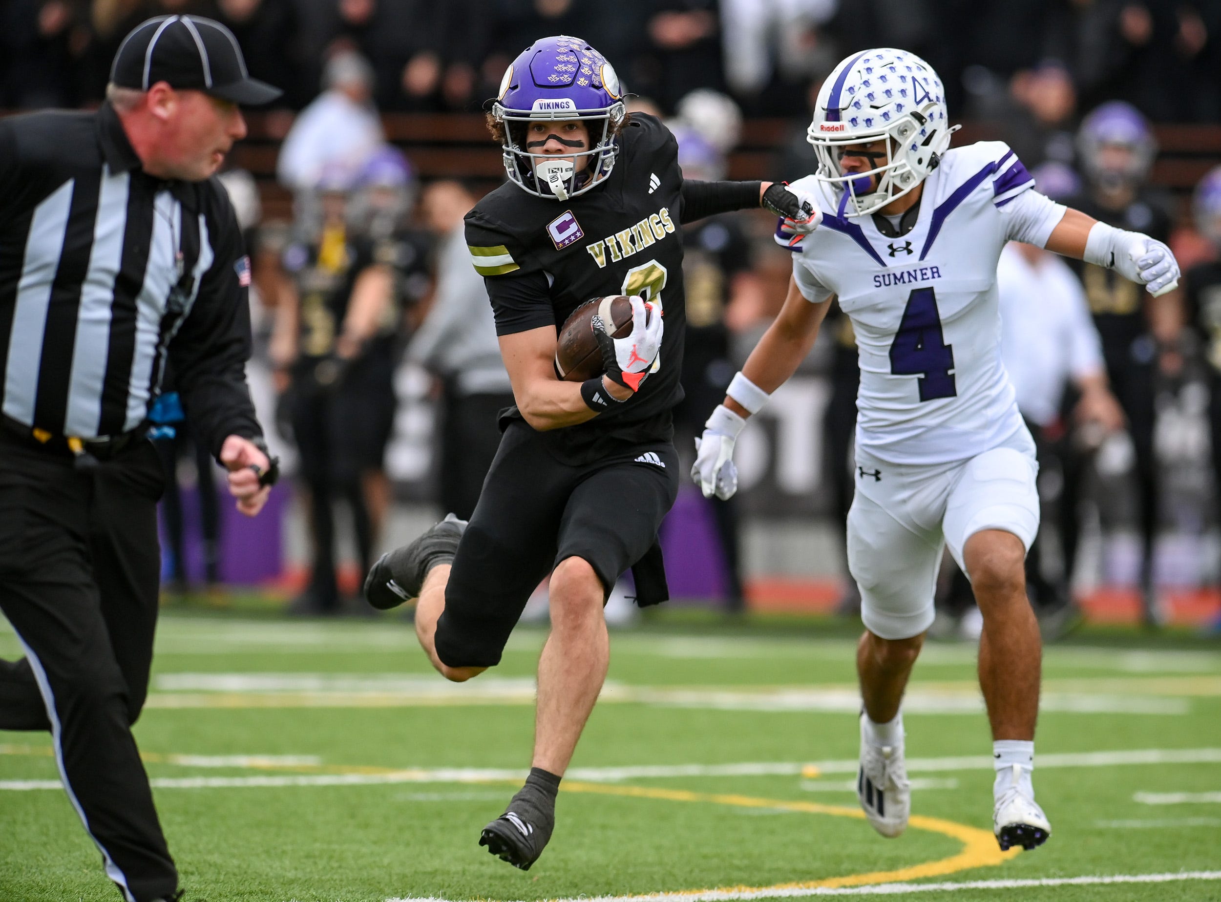 Braylon Pope of Sumner fights off Jayden Woodland down the Sumner sideline.
