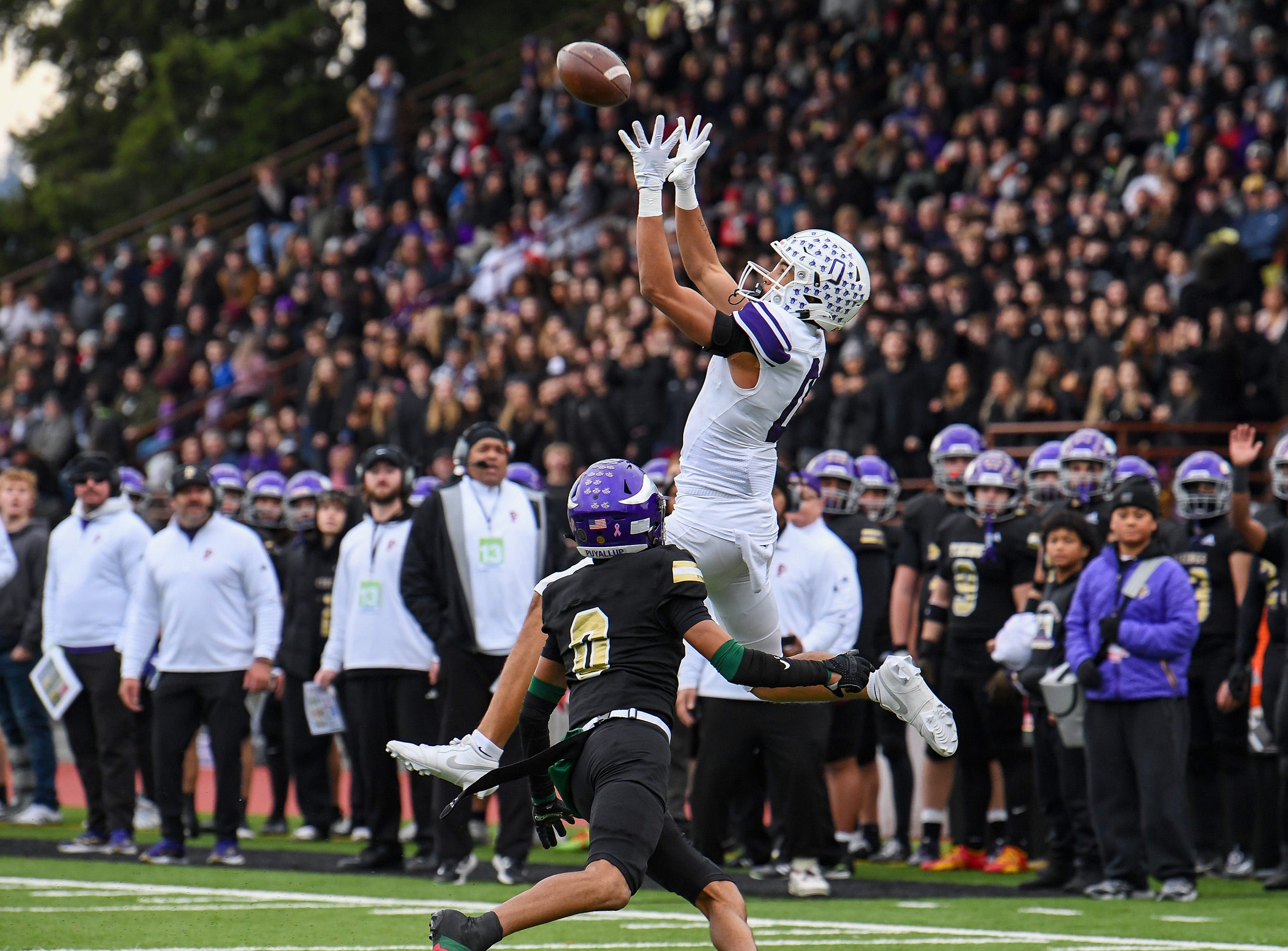 Braylon Pope goes up high over Puyallup’s Jasiah Denmark, to set up Sumner’s first score.